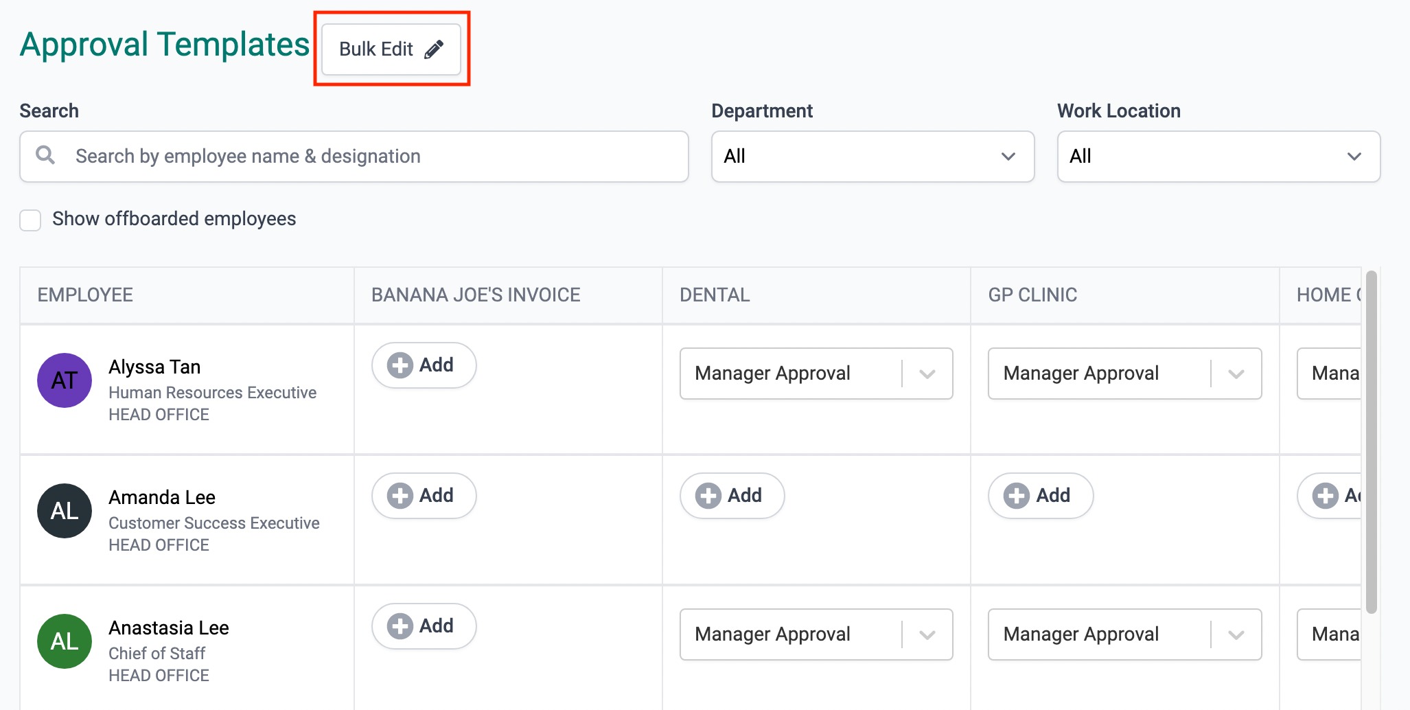 Click the 'Bulk Edit' Button to access the various ways you can assign approvals for multiple employees at once.
